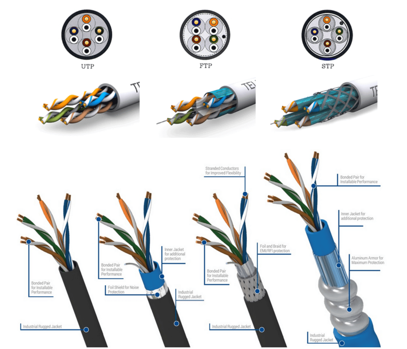 Los cables Ethernet UTP con apantallamiento (Foiled Twisted Pair/Shielded Twisted Pair) están envueltos en una capa de protección adicional para brindar una mayor protección contra interferencias externas. Estos cables son más caros que los UTP sin apantallamiento pero son más adecuados para entornos donde las interferencias electromagnéticas son comunes, como en oficinas grandes u otros entornos con equipos electrónicos cercanos. El apantallamiento ayuda a garantizar una conexión más estable y confiable al reducir la interferencia electromagnética.